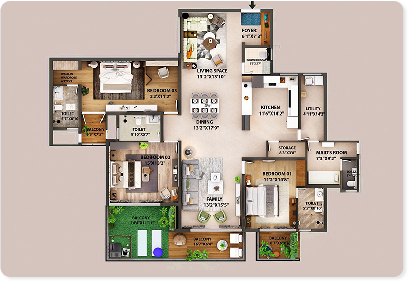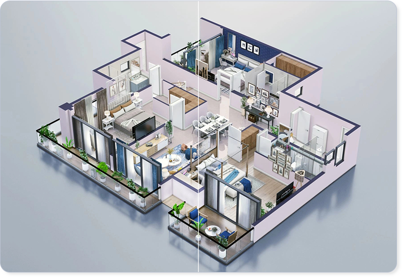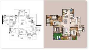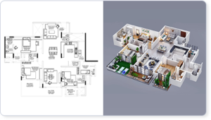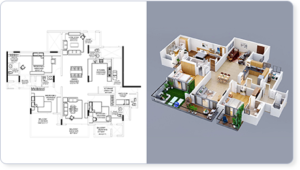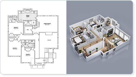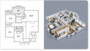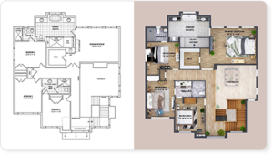 2D floor plans are now essential features in the real estate market. Present customers with a professional floorplan, showcasing house layout with textured floor and furniture.