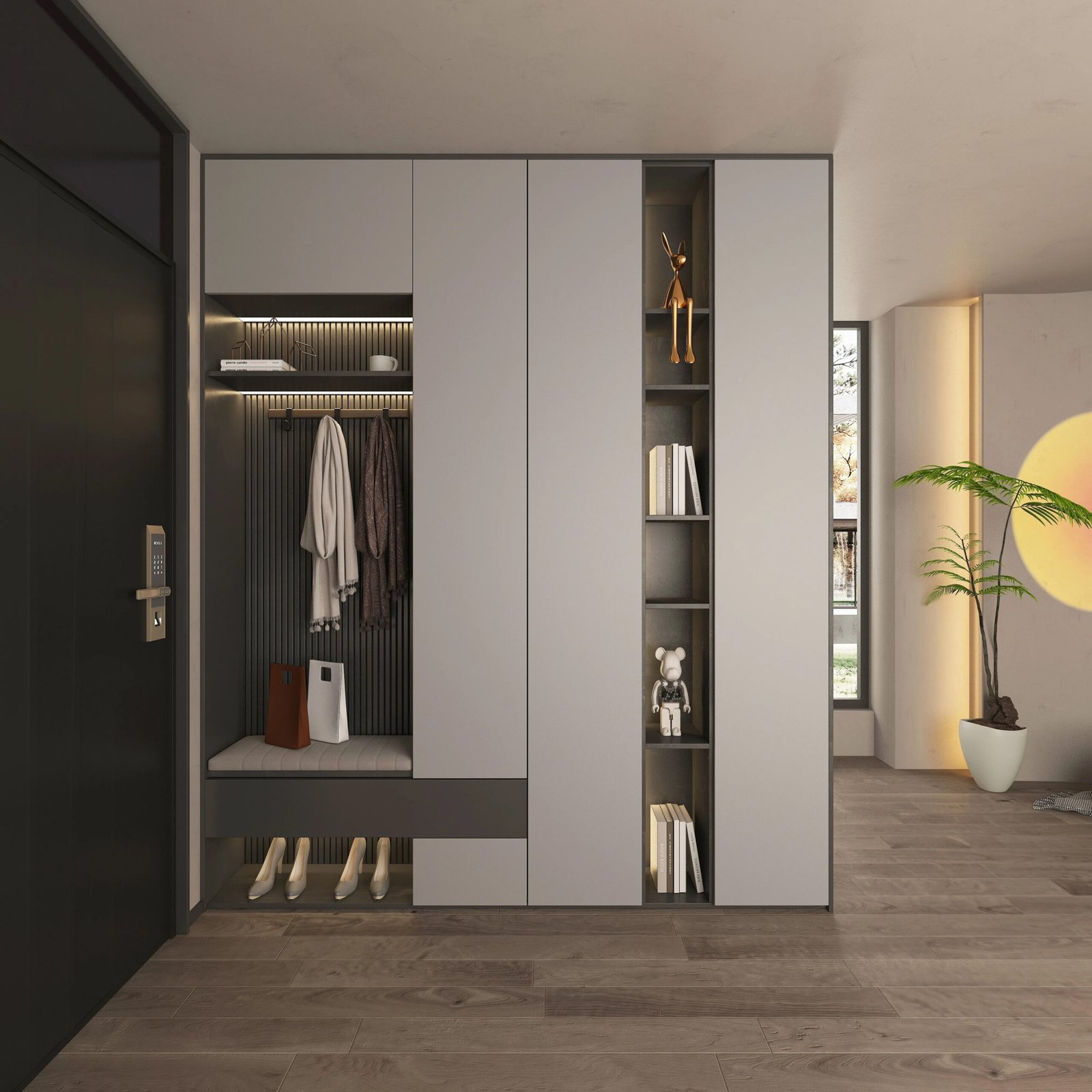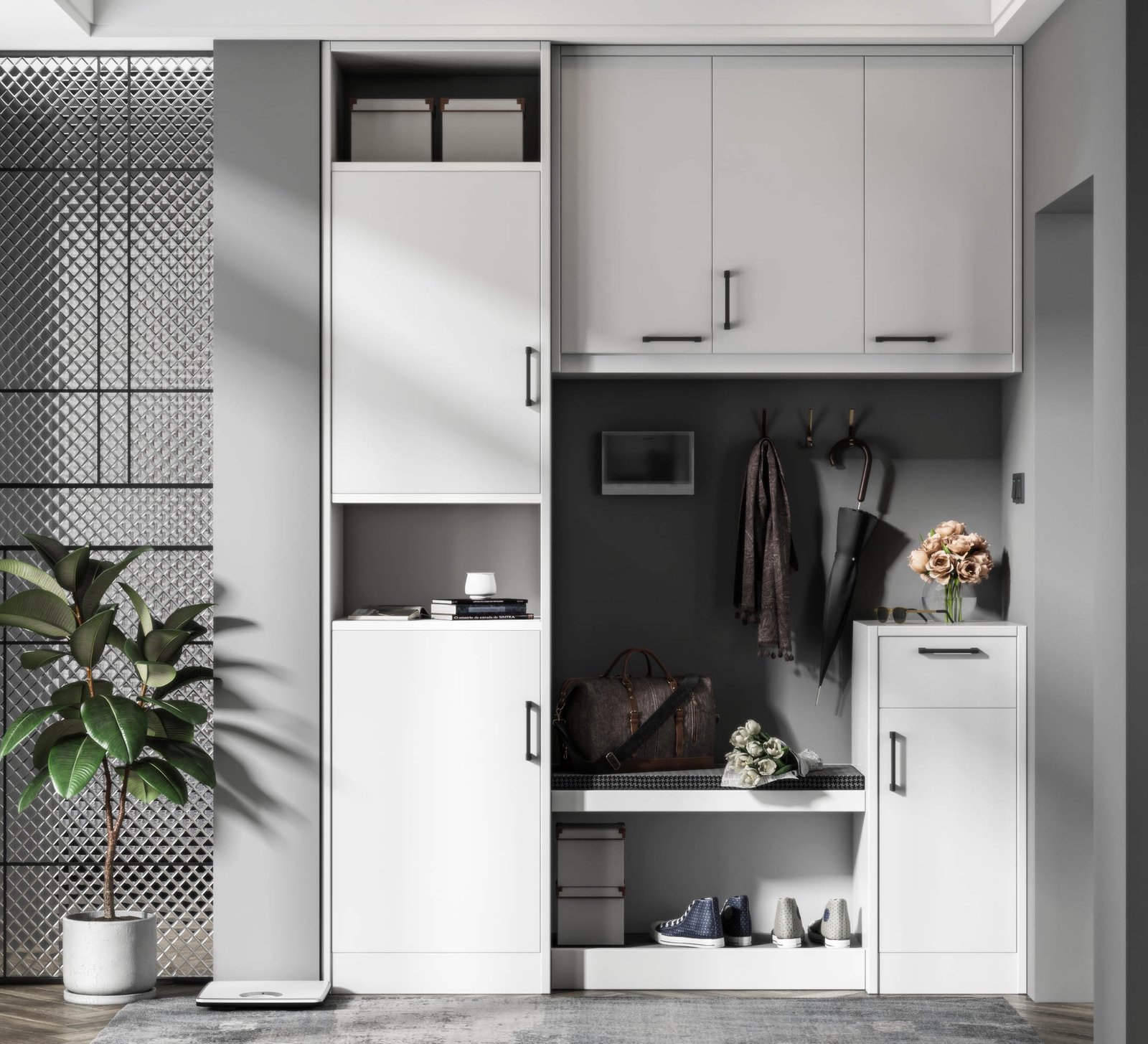 A functional entrance hall cabinet combines shoe storage, coat hooks, and a seating bench. Ventilated shelves prevent odors while top drawers organize essentials. Optional motion-sensor lighting enhances nighttime usability. Stylish designs create a welcoming first impression for any entryway.