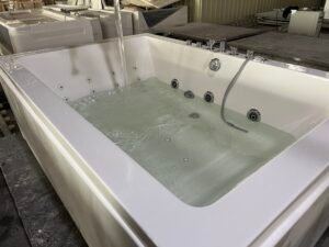 Single-handle deck faucets: 4-8″ center set with dual-temperature control (NSF/ANSI 61 compliant).