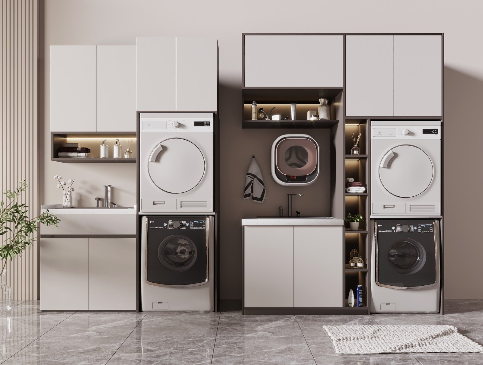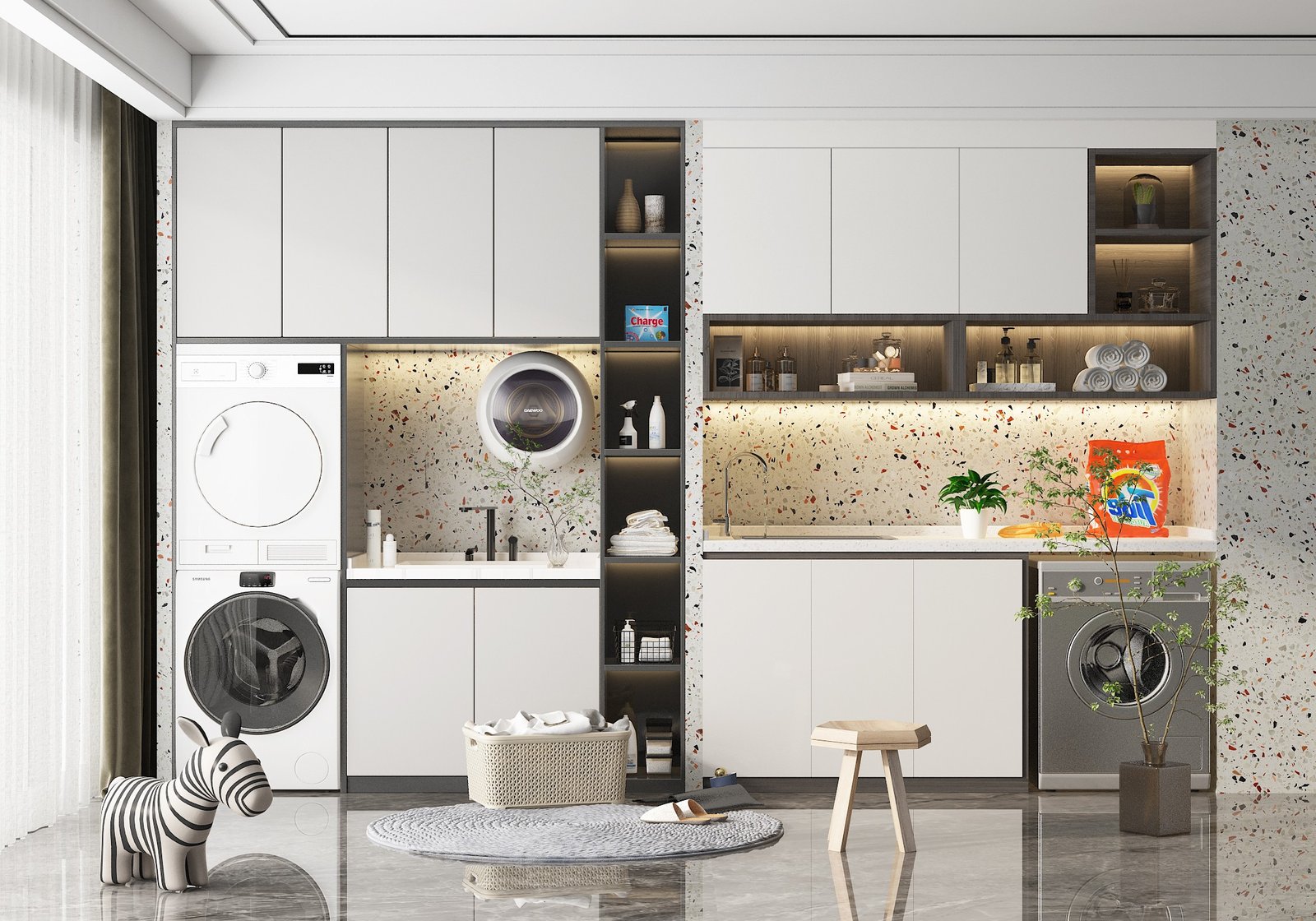 Water-resistant laundry room cabinets feature foldable ironing boards and hampers. Countertops accommodate washers/dryers while upper cabinets store detergents. Compact designs maximize small spaces for organized, efficient laundry routines.